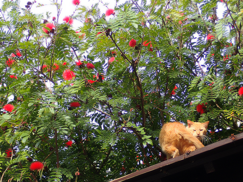 奄美大島で鮮やかな紅色の花を咲かせるベニコウガン(学名:Calliandra selloi)。パフのような雄しべと夜に閉じる繊細な葉が特徴です。サボテンにも「紅光丸」という種類があるらしいです。庭先での観察ポイント、四季咲きの魅力を「奄美の草花さんぽ帖」が詳しく解説します。 形態的特徴: 花: 鮮やかな紅色の糸状の雄しべが、球状(パフ状)に集まって咲きます。基部は白く、先がピンク〜赤色になります。 葉: 2回羽状複葉で、普通のネムノキよりも葉が細かく密生しています。 運動: 夜間や低照度下で葉が閉じる「就眠運動(休眠運動)」を行います。 分布域/生育環境: ブラジル南東部〜アルゼンチン原産。 奄美では庭園や公園の植栽として広く見られます。 奄美特有情報: 名称の混同: 奄美の多肉植物愛好家の間では、小型サボテンの Echinopsis arachnacantha(紅光丸)を指すこともあります。 地域性: 奄美大島や沖縄など暖かい地域では、周年開花に近く、風景を彩る「街の花便り」として定着しています。