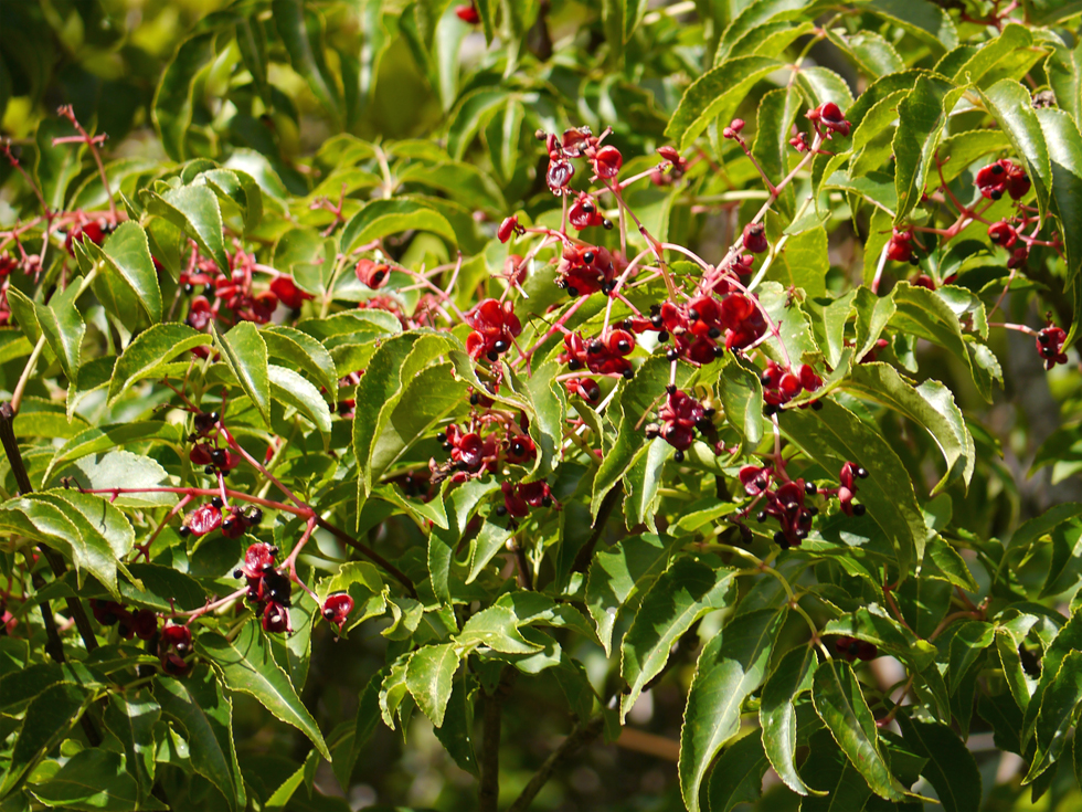 🌿 和名:ゴンズイ(権萃) 学名:Euscaphis japonica (Thunb.) Kanitz 撮影:**月/林床 花はまだ見ていない。赤い実は10月。 見分け:花弁*枚・白中心 花はまだ見ていない。
