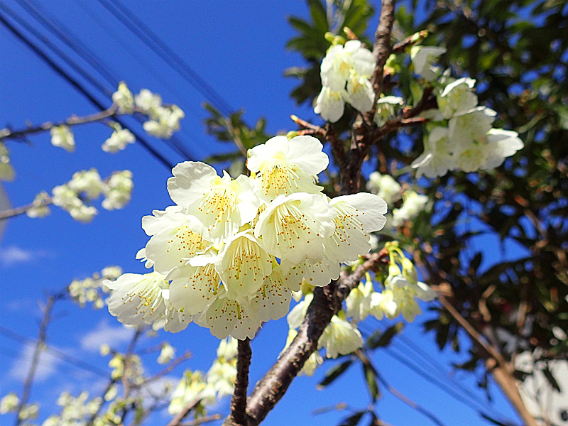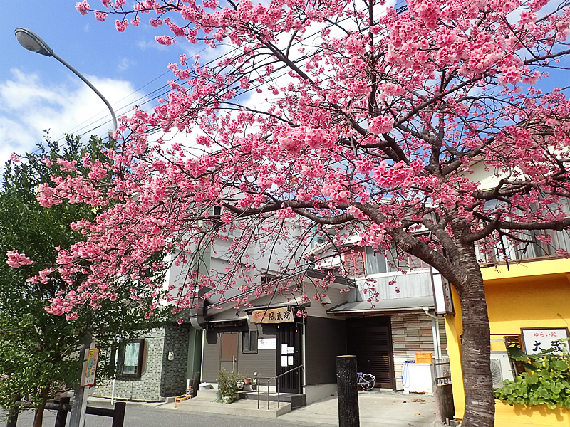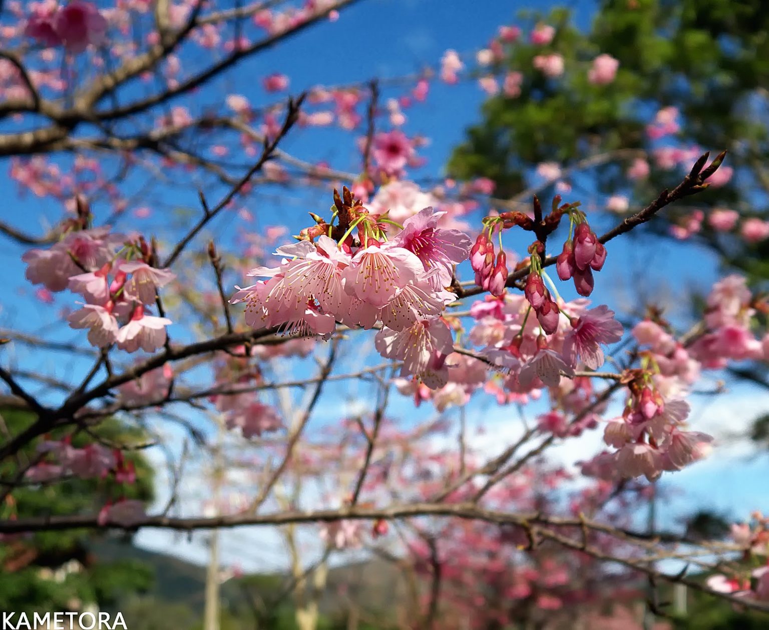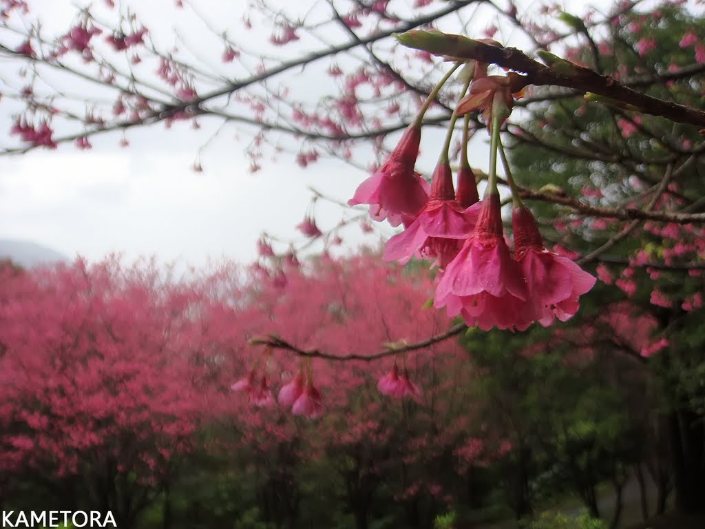 奄美大島の冬の風物詩、緋寒桜(カンヒザクラ)。鮮やかな緋色の花を釣り鐘状に咲かせるのが特徴です。1月〜2月にかけて見頃を迎え、奄美自然観察の森では満開の桜とルリカケスなどの貴重な野鳥観察も楽しめます。日本で一番早く咲く桜の生態をお届けします。 開花時期は1月〜3月頃で、奄美では1月中旬から開花が始まり、「日本で一番早く咲く桜」として知られています。 また、カワヅザクラ(河津桜)などの早咲き品種の交配親としても重要な役割を果たしています。 独特な花の形と色:ソメイヨシノのように花びらが大きく平らに開くのではなく、カンパニュラのように釣り鐘状(ベル状)で下向きに半開きの状態で咲くのが最大の特徴です。 花色は非常に鮮やかな濃い紫紅色(緋色)をしています。 樹高と葉:樹高は一般的に5~8m程度です。葉は長さ8~13cmの長楕円形で、表面は光沢のある濃緑色をしています。 潔い散り方:花びらが一枚ずつ舞い散るのではなく、萼(ガク)がついたまま花首から「ボトッ」と丸ごと落ちる特徴があります。 木の下に花がそのまま落ちてピンク色の絨毯のようになります。 本土の感覚では「首が落ちる」ようで縁起が悪いとされることもありますが、沖縄などでは「別々に散るより、家族が一緒という意味」と好意的に解釈されることもあります。 桜前線が「南下」する:サクラは通常、寒さを経験して休眠から目覚める(休眠打破)性質があります。 沖縄では冬の訪れとともに北部の山間部から先に冷え込むため、本土とは真逆で「北から南へ」と桜前線が降りていくという珍しい現象が起きます。 奄美における興味深い話 開花宣言の「標本木」:日本全国の桜の開花予想は一般的にソメイヨシノが基準ですが、ソメイヨシノが育ちにくい鹿児島県奄美地方や沖縄県では、このヒカンザクラが開花の基準となる標本木に指定されています。奄美大島の龍郷町では、「奄美自然観察の森」に植えられているヒカンザクラの「標準木」に5輪以上の花が咲くことで開花宣言が出されます。 野鳥観察と桜のコラボレーション:その「奄美自然観察の森」とその周辺の町道は、1月下旬から2月にかけて約1,000本ものヒガンザクラ(ヒカンザクラ)が満開になり、見事な景色を作り出します。 この時期の奄美大島では、鮮やかな桜の花とともに国指定天然記念物であるルリカケスなどの貴重な野鳥を同時に観察することができ、世界中から野鳥ファンが訪れる冬の風物詩となっています。