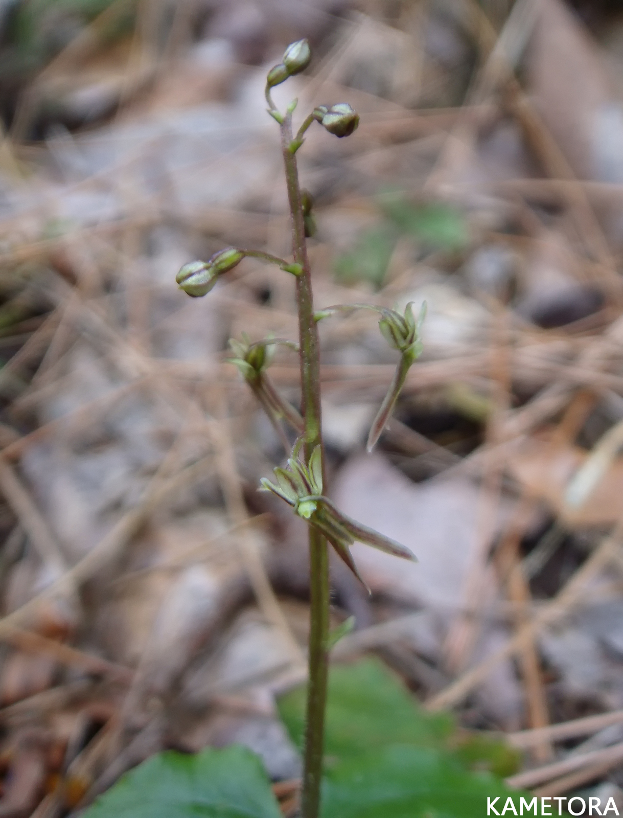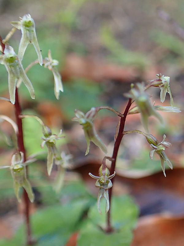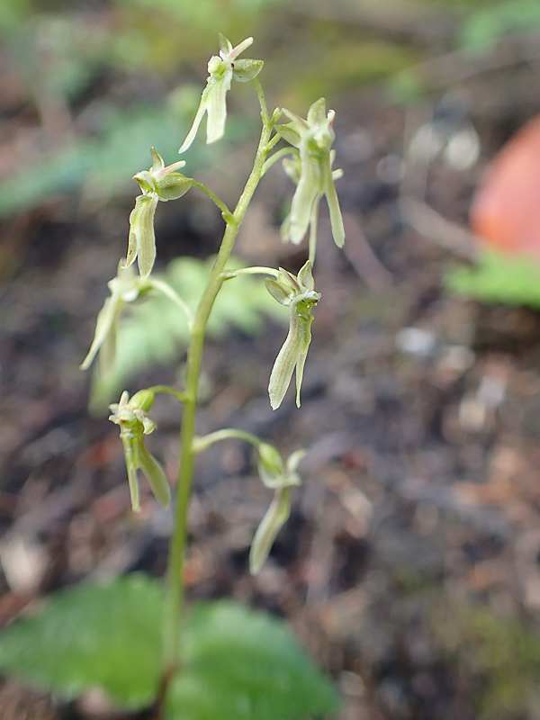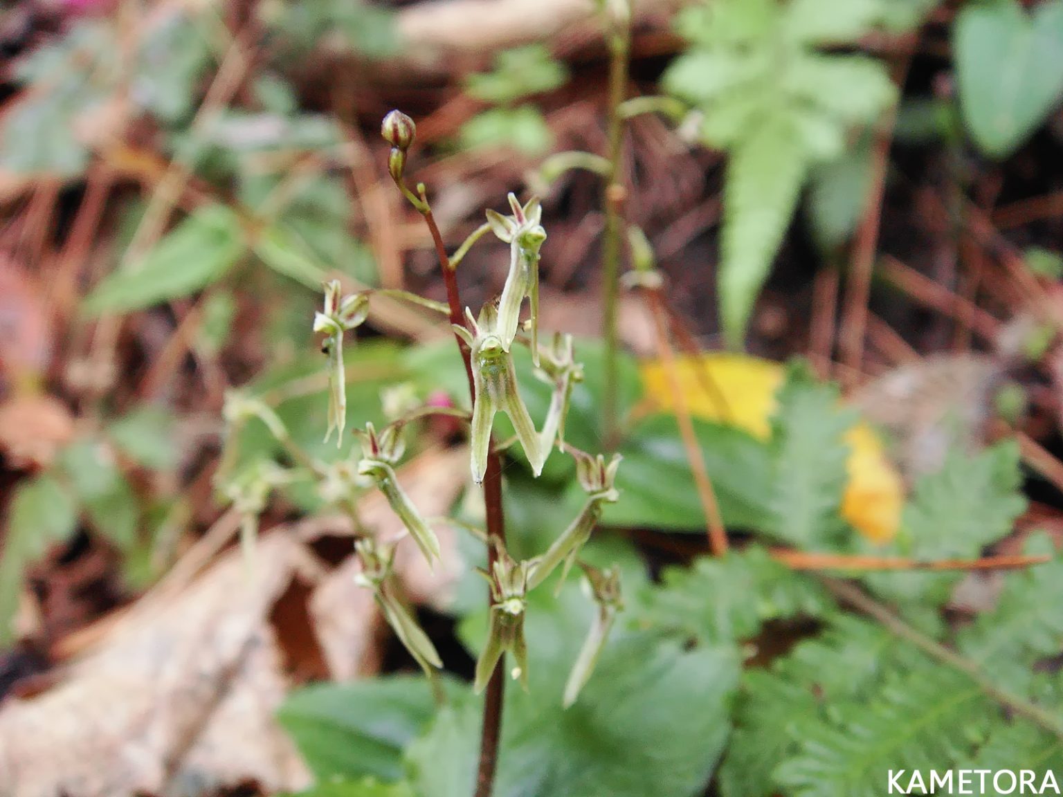 美大島の冬の森でひっそり咲く野生蘭「ヒメフタバラン(学名:Neottia japonica)」。 唯一の南方系フタバランで、沖縄などでは12月〜2月頃に開花します。 逆Y字形に裂けた独特な唇弁をもつ淡紫褐色の小さな花や、対生する2枚の葉といった外見的特徴と観察ポイントを詳しく解説! 形態的特徴(花・葉・茎): 葉:茎の中央付近に1〜2cmほどの卵状三角形の葉が2枚向かい合って(対生状に)つく。 茎:四角形で、葉より上の花茎には腺毛が生える。 花:淡紫褐色の小さな花が1本の花茎に2〜6個咲く。逆さまの状態で咲き、唇弁が長さ6〜8mmで先端が深く「逆Y字形」に裂ける。 分布域/生育環境: 本州(宮城県以南)から四国、九州、沖縄、韓国(済州島)、台湾。主に暖地の常緑樹林(照葉樹林)や湿った林床。日本に自生する唯一の「南方系」のフタバラン。 花期: 本州では3〜5月、奄美や沖縄などの南の島では12月〜2月頃の非常に早い時期。 奄美特有情報(方言・利用法・等): 本州とは異なり、南の島ならではの「冬場の非常に早い開花」を観察できるのが大きな特徴。