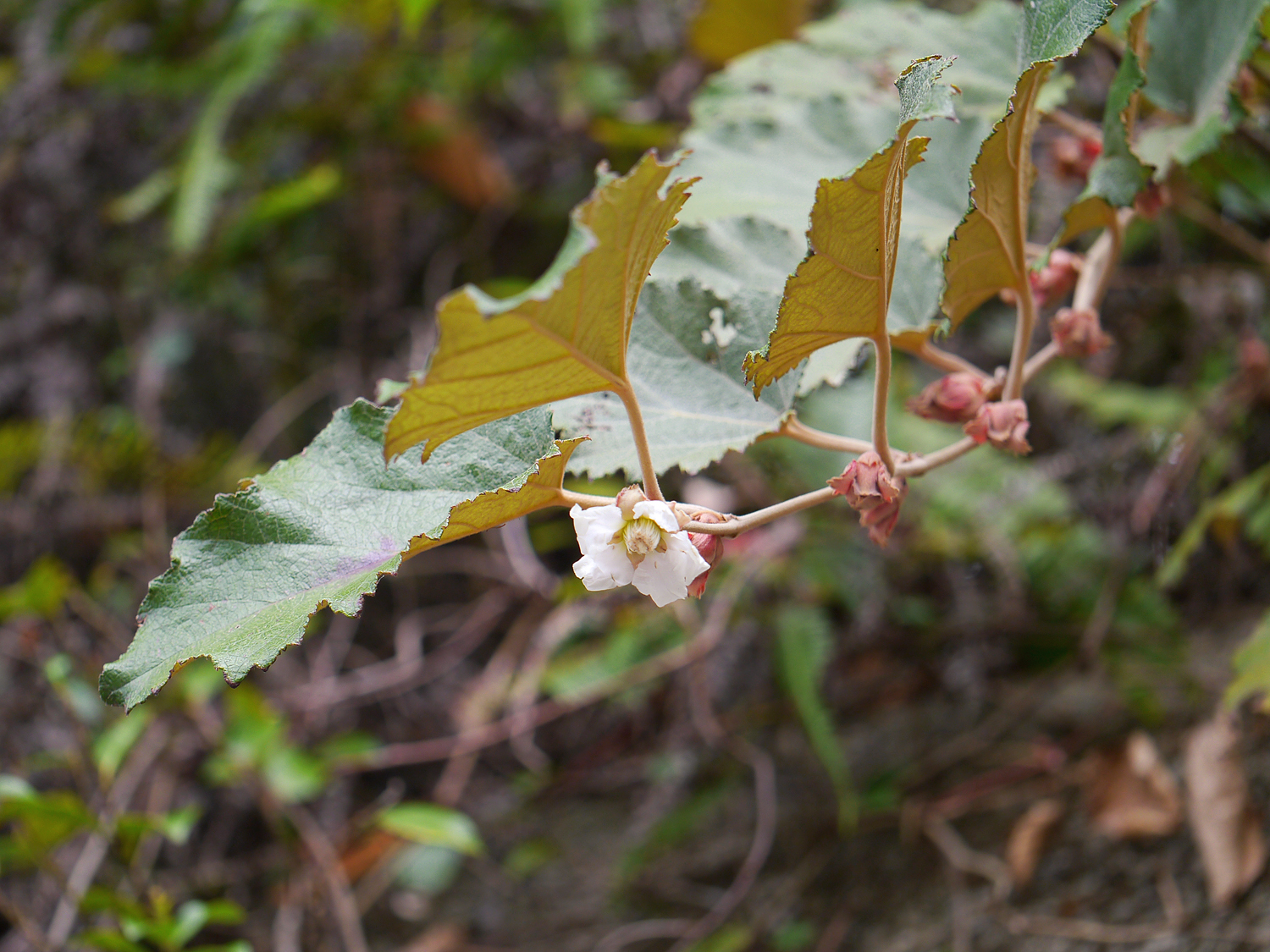 奄美大島で見られるホウロクイチゴ(学名: Rubus sieboldii)は、大きくて固い葉と裏面の綿毛が特徴的な常緑キイチゴです。 「イチゴの下にはハブがいる」という言い伝えや、甘酸っぱい赤い果実の魅力、野のイチゴにまつわる思い出などをご紹介します。 生育型/草丈: ややつる性の常緑低木。樹高は1.5m前後になり、太い枝が弓状に伸びて地を這うように成長する。 形態的特徴(花・葉・茎): 常緑キイチゴの中で最大級(長さ8〜17cm)の厚く硬い革質の葉を持つ。 葉の表面は深いシワ、裏面は綿毛が密生している。 枝や葉柄には綿毛とともに鋭い棘がある。花は直径2.5〜3cmほどの白色で下向きに咲く。 分布域/生育環境: 本州(関東・伊豆半島以西)、四国、九州、沖縄、南西諸島など。 海岸近くの山地の林内や林縁の斜面に好んで生育し群生する。 奄美特有情報: 奄美群島の徳之島などでは「春の森の甘味」として親しまれたが、実を採る際には「イチゴの下にはハブがいる」と言い伝えられ、注意喚起されていたという地域ならではの面白いエピソードがある。
