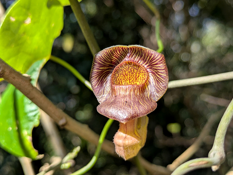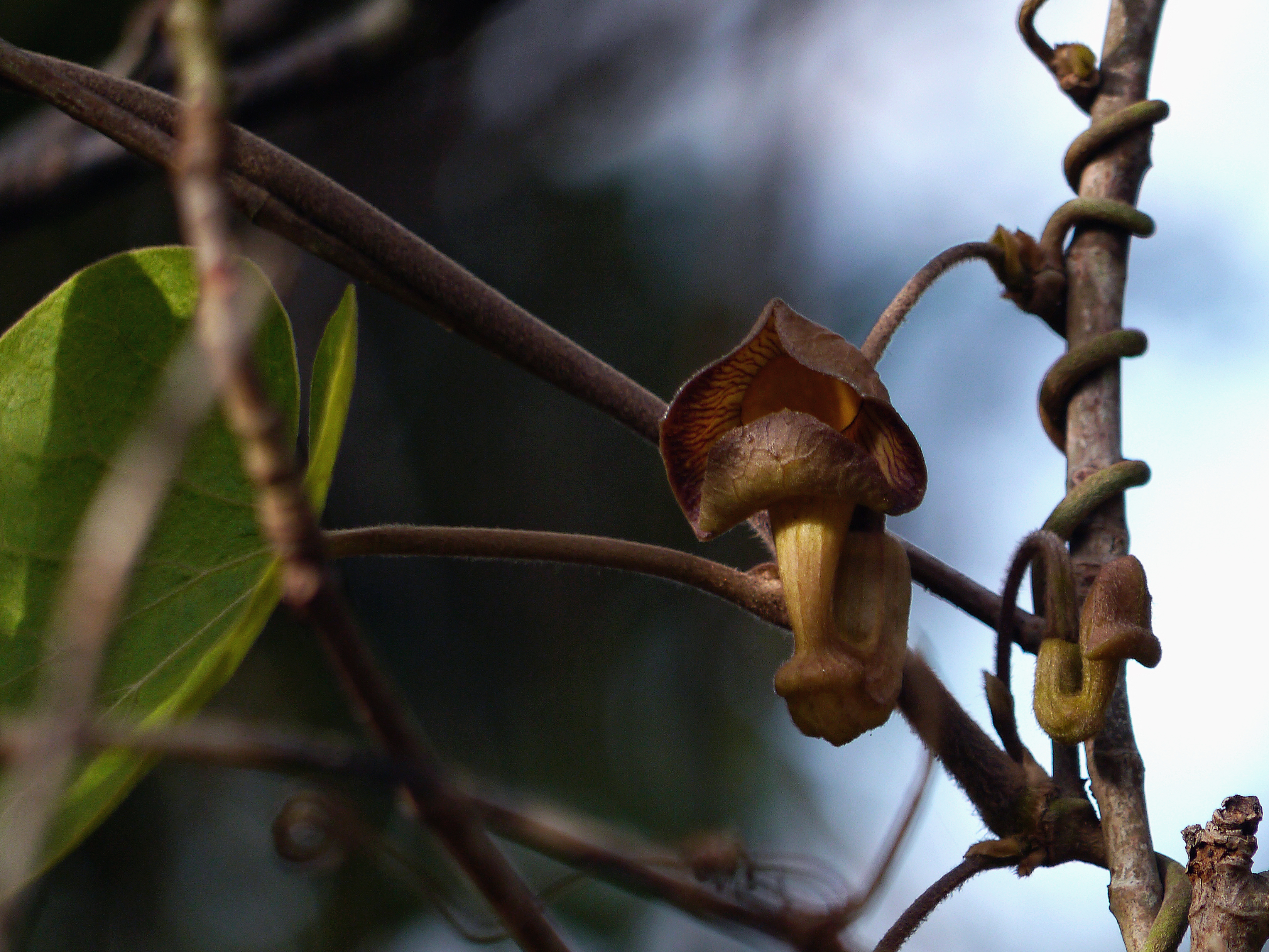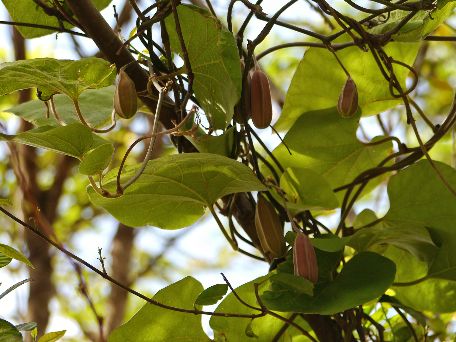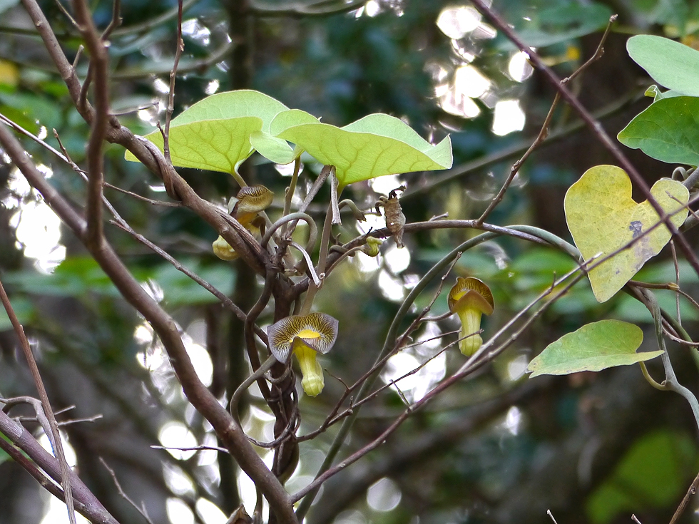 奄美大島の林縁で見られるリュウキュウウマノスズクサ(Aristolochia liukiuensis)。サクソフォン型の奇妙な花とハート形の葉が特徴です。ジャコウアゲハの食草でもある貴重な固有種の、受粉の秘密や観察ポイントを詳しくご紹介します。 形態的特徴: 花: 暗紫褐色で、花弁はなく萼(花被)が筒状に合着しています。サクソフォンや喫煙パイプのような独特な形状をしており、内部には逆毛があって、受粉のためにハエを一時的に閉じ込める仕組み(トラップ型)を持っています。 葉: 広卵状心形(ハート形)で、長さは5〜15cmほど。表面には光沢があり、裏面は帯白色で軟毛が密生しています。 茎: つる性で、成長すると木質化します。若枝には灰白色の毛が密生するのが特徴です。 リュウキュウウマノスズクサの果実は**「蒴果(さくか)」**と呼ばれ、以下のような特徴を持っている。 形状: 円筒形から長楕円形をしており、表面には6つのくっきりとした稜(りょう)があるのが特徴。 大きさ・表面: 長さは約5~7cmほどで、表面には細かい毛が生えている。 熟した時の様子: 完全に熟すと果実が花のように裂けて開き、中からトウモロコシの粒が並んだような形状の種子が現れることがある。 名前の由来: 「ウマノスズクサ(馬の鈴草)」という名前自体が、この独特の果実の形が、馬の首に付ける鈴(馬鈴)に似ていることに由来すると言われている。 奄美特有情報: 蝶との関係: ジャコウアゲハ(奄美亜種)、ベニモンアゲハなどの幼虫の重要な食草です。植物に含まれる有毒成分(アリストロキア酸)を体内に取り込むことで、鳥などの外敵から身を守ります。 レッドデータ: 鹿児島県レッドリストで「絶滅危惧II類 (VU)」に指定されている貴重な植物です。