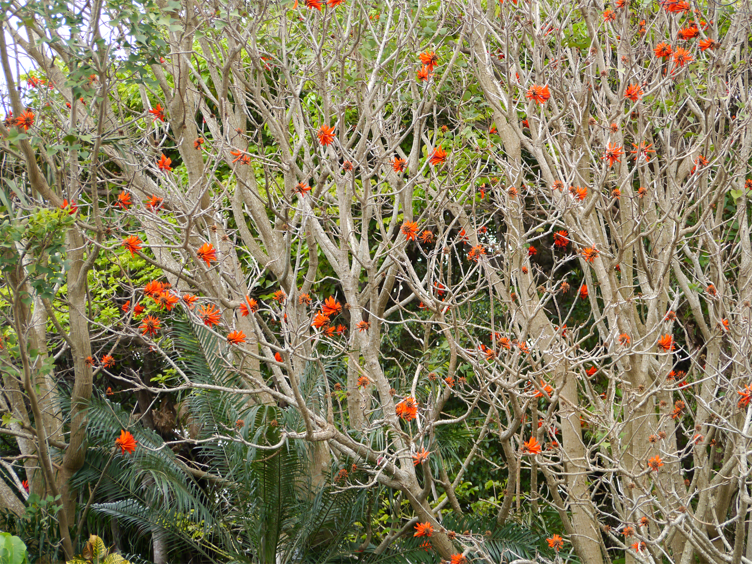 奄美大島でおなじみのデイゴとは別種です! ブラジルデイゴ(学名:Erythrina speciosa)は、武将の「采配」のように直立した赤い筒状の花が特徴のマメ科の植物。 幹のトゲや、下から順に咲き進むユニークな花の観察ポイントを解説します。 形態的特徴(花・葉・茎): 花: 晩冬から早春にかけて、茎の先端に長さ約50cmの直立した総状花序をつける。赤やピンクの細長い筒状の花が密集し、花びらは開ききらずに、下から上へ順に咲き進む。 葉: 3出複葉で、菱形から菱状卵形をしている。特に頂小葉は14〜20cmと大きい。 幹: 樹皮は粗くコルク質で、大きな刺が存在する。 分布域/生育環境: 南アメリカのブラジル原産(大西洋岸森林や都市部)。日本では温暖な地域や温室でよく見られる。 花期: 1〜4月頃(日本では晩冬〜早春)。 奄美特有情報: 奄美大島によく自生する県花「デイゴ(Erythrina variegata)」とは全くの別種!名前が似ているため混同されやすいですが、花が直立する姿などで明確に区別できる。